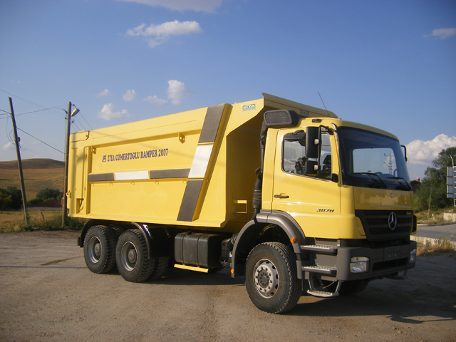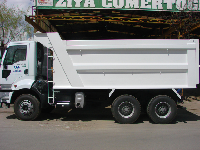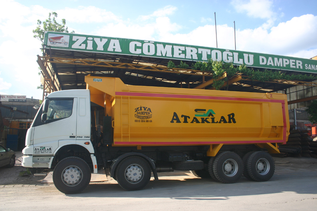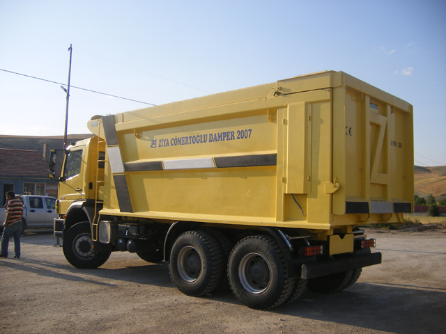 “Hardox” ibaresi, damper gövdesinin aşınmaya dayanıklı yüksek mukavemetli çelikten yapıldığını gösterir (örn. Hardox 450).